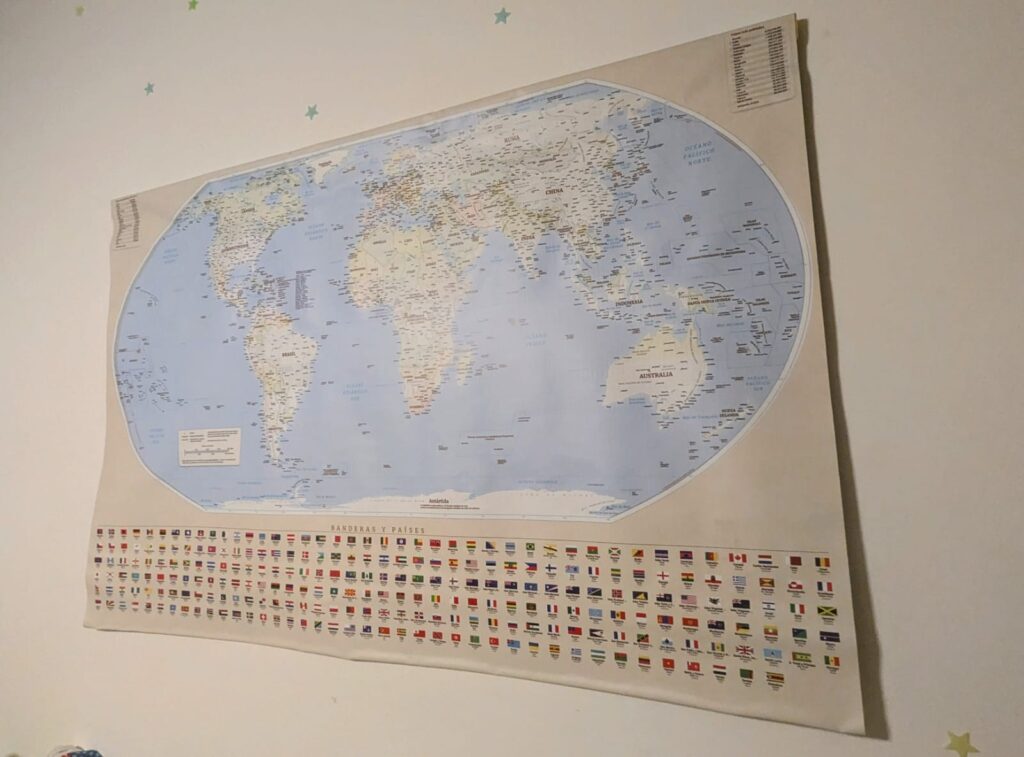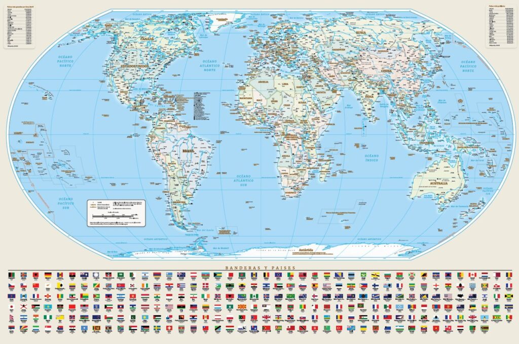 Tomé el enorme trabajo del gran Tom Patterson con su proyección Equal-Earth y la armé en un pdf para imprimir con todas las banderitas de los países abajo (obtenidas de https://github.com/hampusborgos/country-flags), con sus nombres en castellano (datos obtenidos desde RestCountries) Con algunos ajustecitos manuales y corrección de banderas, está listo para imprimir.